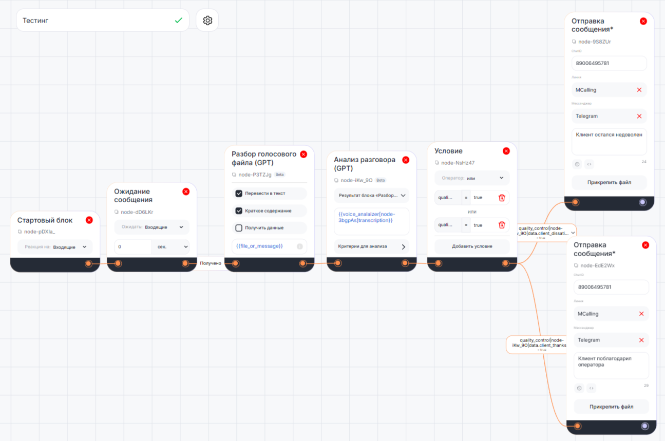 5. Блок «Условие» создает два варианта развития сценария: если по результатам анализа критерий «Клиент был недоволен» верен, блок «Отправка сообщения*» присылает руководителю сообщение «Клиент был недоволен». Если по результатам анализа верен критерий «Клиент благодарит оператора», то второй блок «Отправка сообщения*» присылает руководителю сообщение «Клиент поблагодарил оператора».