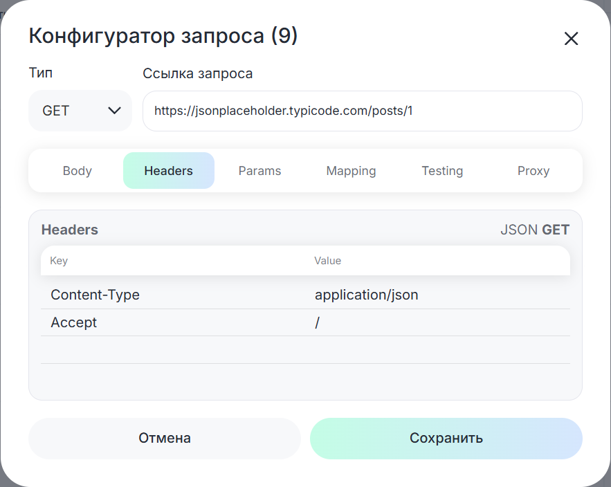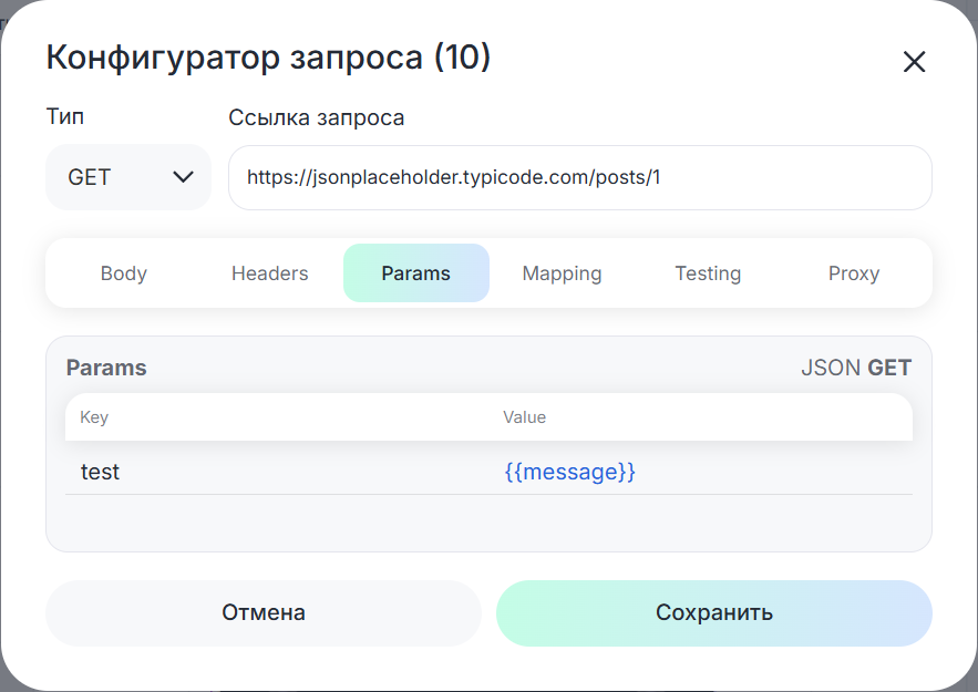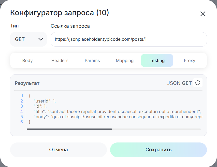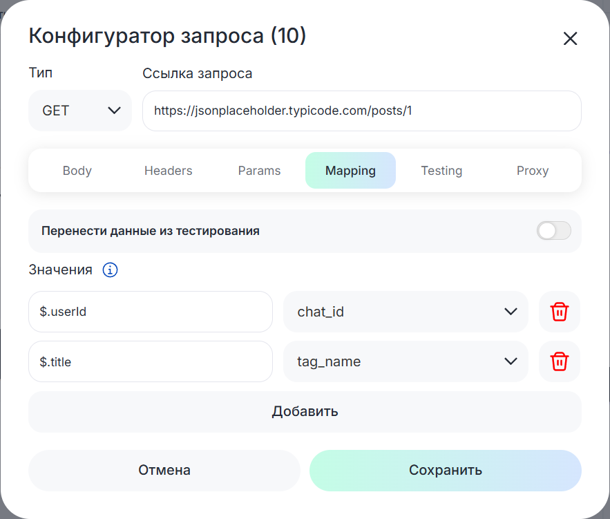 9. Чтобы результат запроса сохранился в переменные, во вкладке «Mapping» нажмите «Передать из тестирования» и выберите нужные переменные для каждого значения. Если значение не нужно сохранять в переменную, то оставьте поле для переменной пустым или введите значения вручную в формате «$.значение». Например,«$.title».