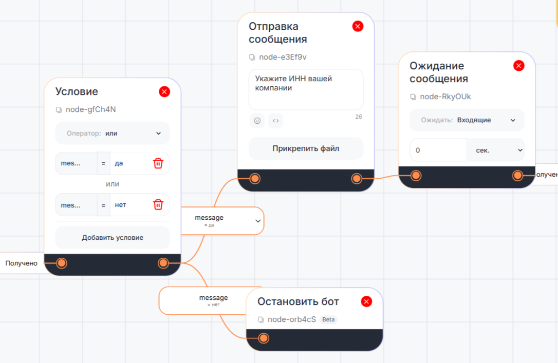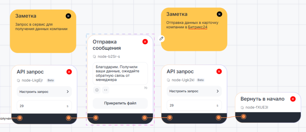 Блок может понадобиться, например, для отдела продаж — бот в диалоге с клиентом запросит ИНН компании, блок «API запрос» отправит результат в сервис автоматической проверки реквизитов компании и внесет данные в карточку компании Битрикс24.