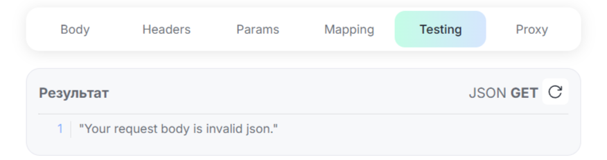 Если в теле запроса содержится ошибка — в результате будет уведомление «Your request body is invalid json».
