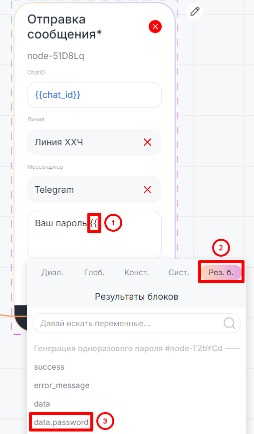 - Чтобы отправить пароль пользователю, используйте блок «Отправка сообщения*». Введите в текстовом поле две фигурные скобки, нажмите «Результаты блоков» и выберите результат «data.password» блока «Генерация одноразового пароля».