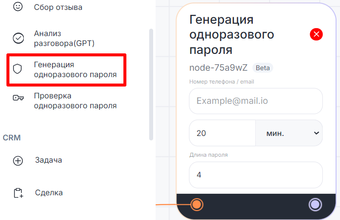 - В Редакторе сценариев выберите блок «Генерация одноразового пароля» и добавьте его на рабочую область.