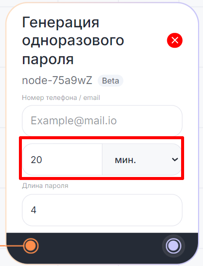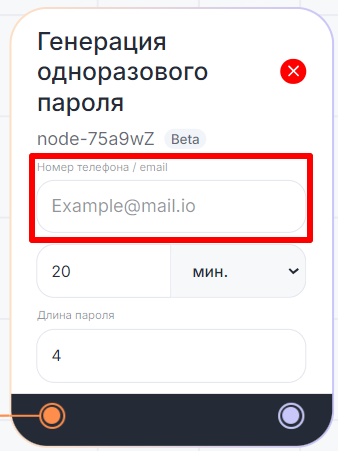 Блок «Генерация одноразового пароля» создает уникальный код и связывает его с идентификатором пользователя — например, номером телефона или почтой. Это может понадобиться для регистрации через форму на сайте, подтверждении заказа в интернет-магазине или платежей.