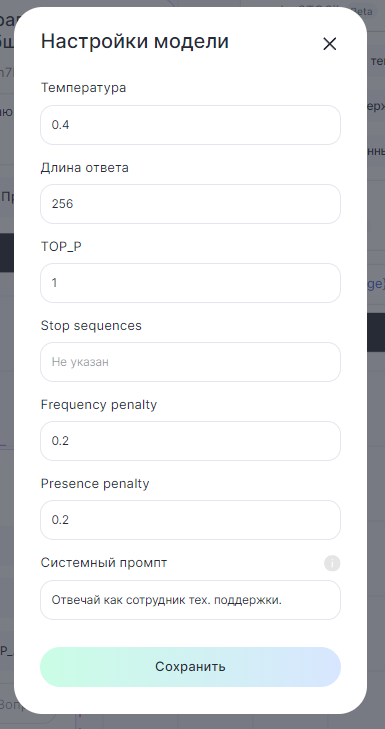 - Выбор модели — модель GPT, которая будет отвечать клиенту;