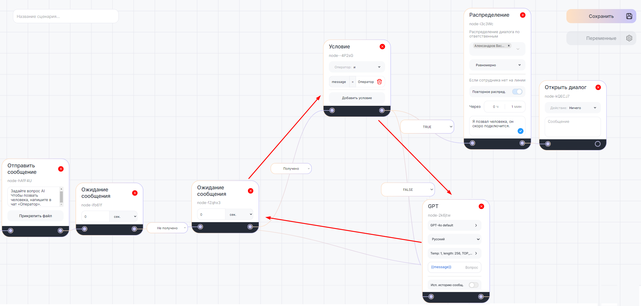 Сценарий на скриншоте цикличен и ChatGPT будет отвечать на сообщения, пока клиент не позовет оператора.
