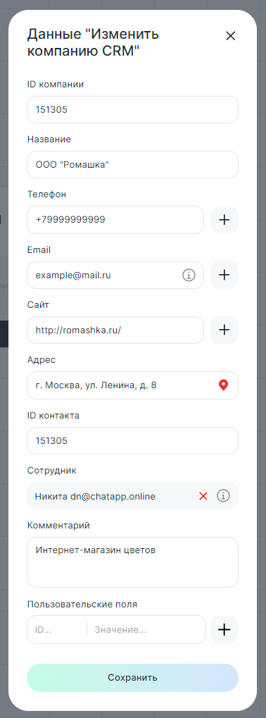 - Блок «Изменить компанию CRM» обновляет данные компании.