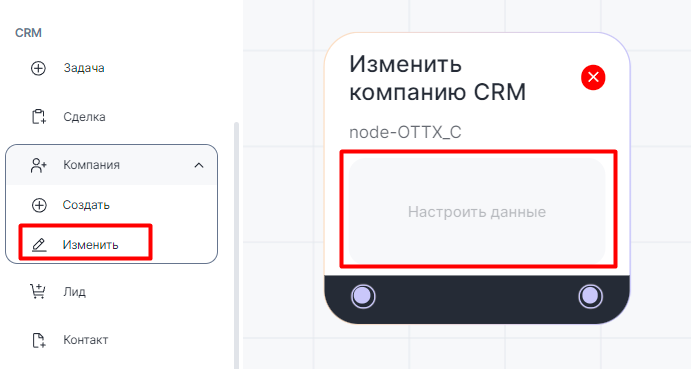 Важно: блок «Изменить компанию CRM» только изменяет элемент, он не сможет проверить наличие компании в CRM-системе.