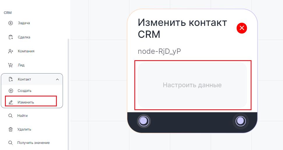 Важно: блок «Изменить контакт CRM» только изменяет элемент, он не сможет проверить наличие такого контакта в CRM.