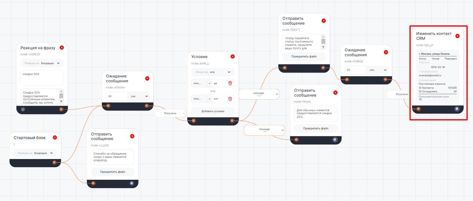 Когда сценарий дойдет до этого блока, в CRM-системе будут автоматически изменены данные контакта.