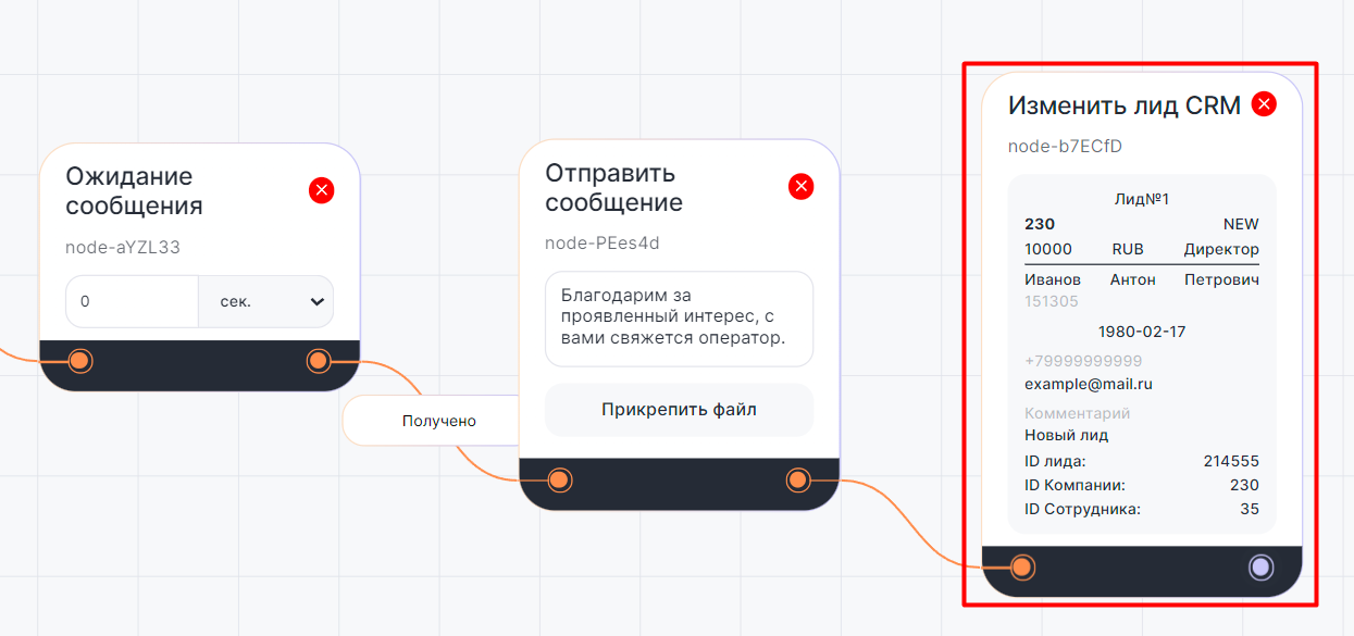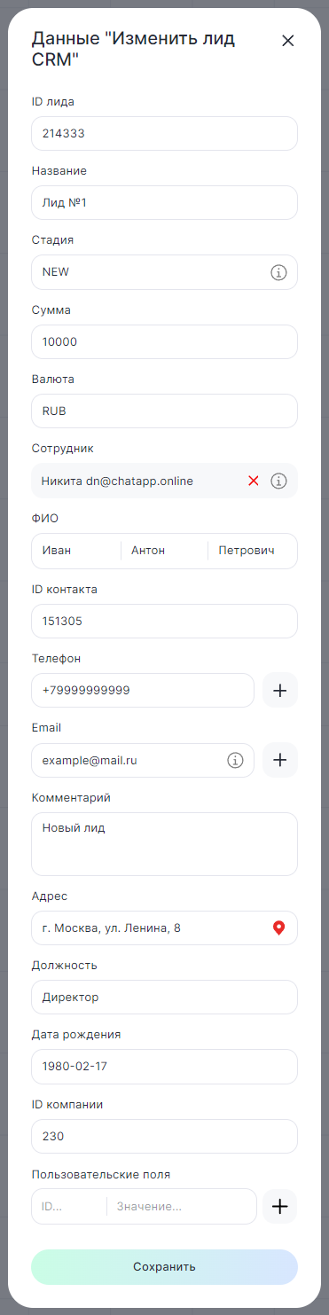 Когда сценарий дойдет до этого блока, в CRM-системе будут автоматически изменены данные лида.
