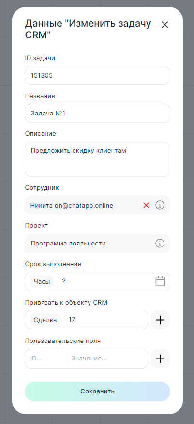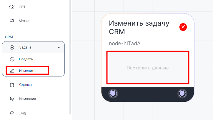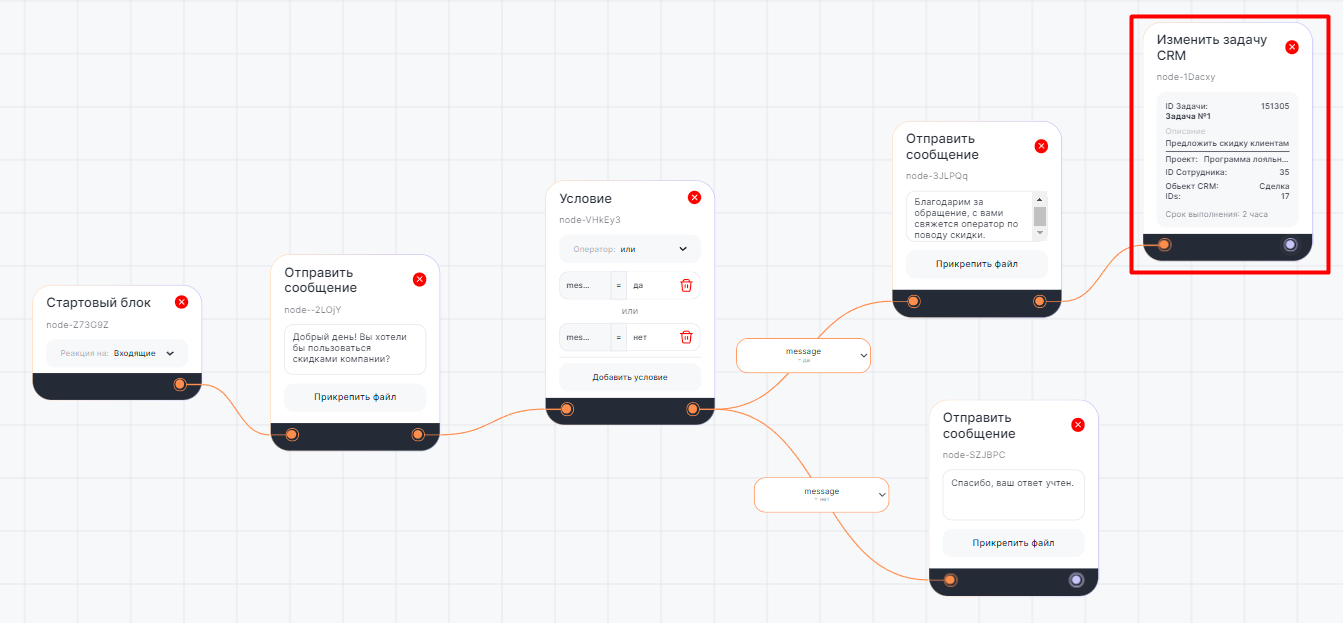 В диалоге бота с клиентом блок «Изменить задачу CRM» автоматически меняет параметры задачи в CRM-системе.