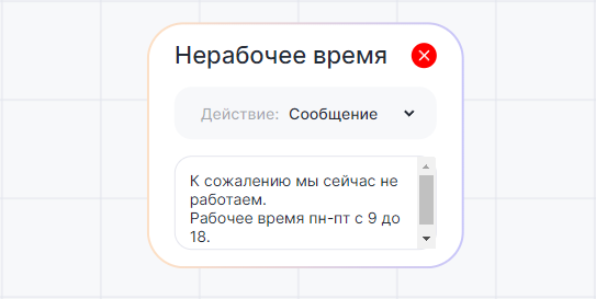 Блок не даст запустить основной сценарий, если клиент написал вам в нерабочее время. Он отправит клиенту заготовленное сообщение. Рабочий график можно настроить в личном кабинете. Как это сделать, описано в статье «График работы»