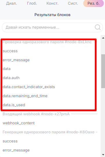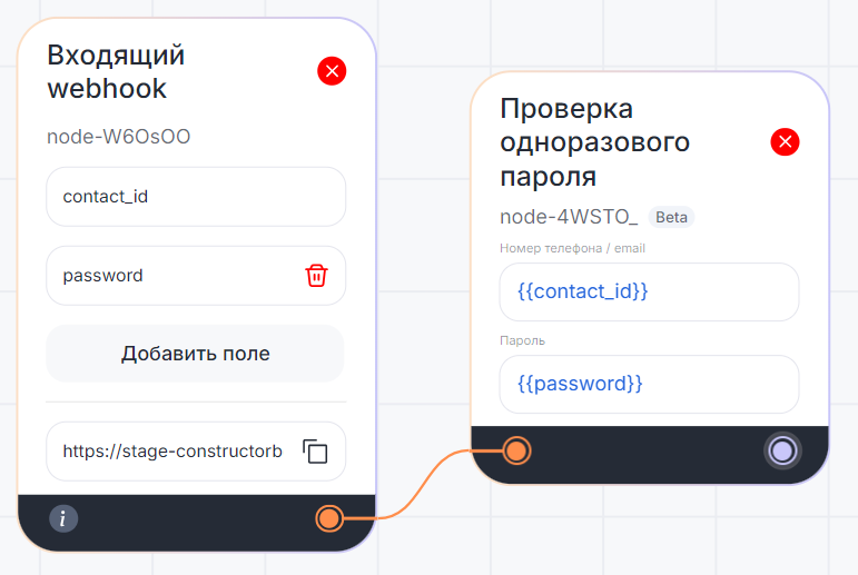 Для создания пароля используется блок «Генерация одноразового пароля». Чтобы блок «Проверка одноразового пароля» получил запрос на проверку пароля из внешнего сервиса и вернул результат, используется блок «Входящий вебхук».