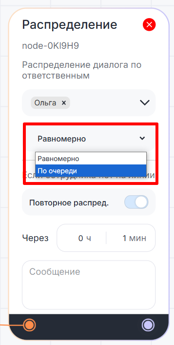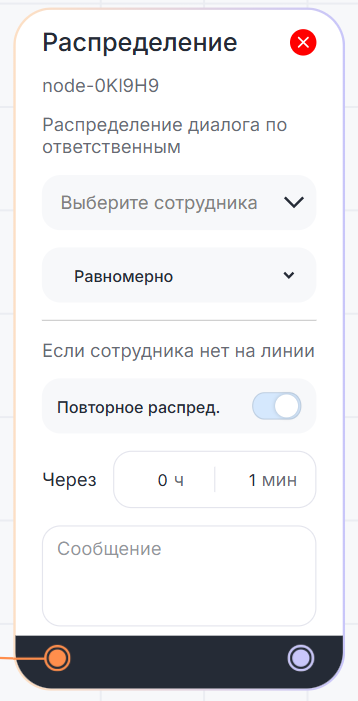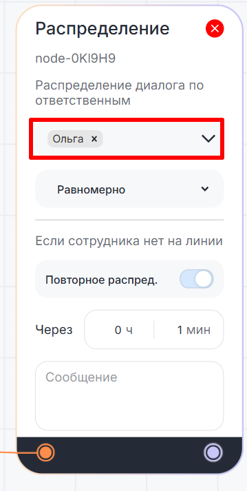 Блок «Распределение» назначает сотрудника, ответственного за диалог. Это пригодится, когда бот собрал нужную информацию и пора подключить в диалог оператора.