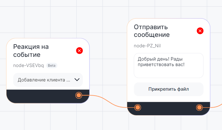 Например, если клиент пришлет файл — сработает блок «Реакция на событие» и бот запустит следующий блок «Отправить сообщение».