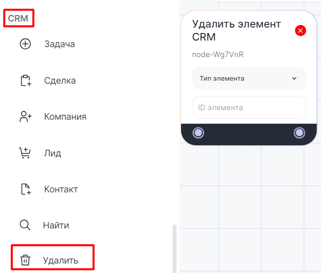 1. В Конструкторе ботов в разделе CRM выберите «Удалить» и добавьте блок в рабочую область.