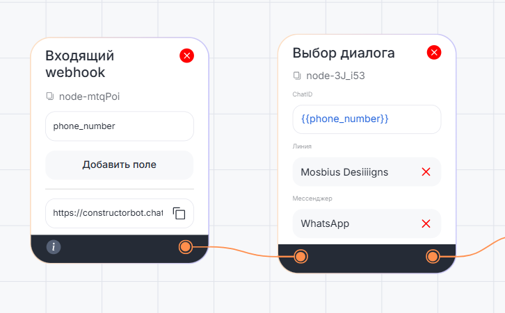 В сценарии с входящим вебхуком блок «Выбор диалога» используется, если нужно найти существующий чат клиента по номеру телефона, переданному через параметры вебхука.
