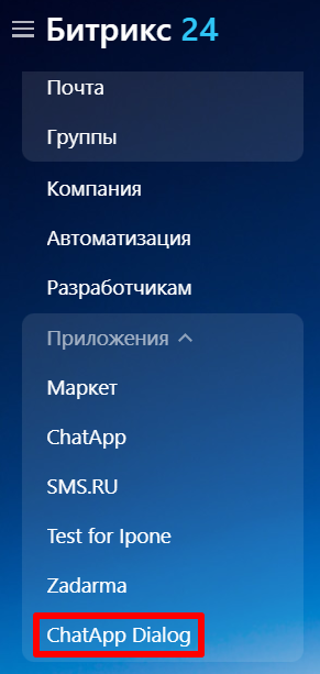 1. В Битрикс24 выберите пункт «ChatApp Dialog» в левом меню — он появится после установки приложения.