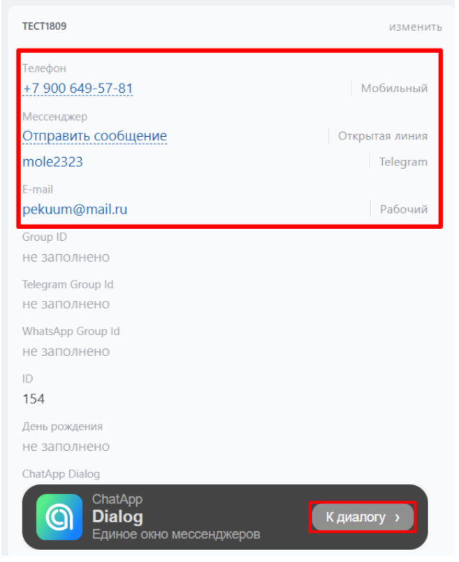 - В карточке появится пункт «ChatApp Dialog». При нажатии «К диалогу», окно с ChatApp Dialog откроется в новой вкладке.