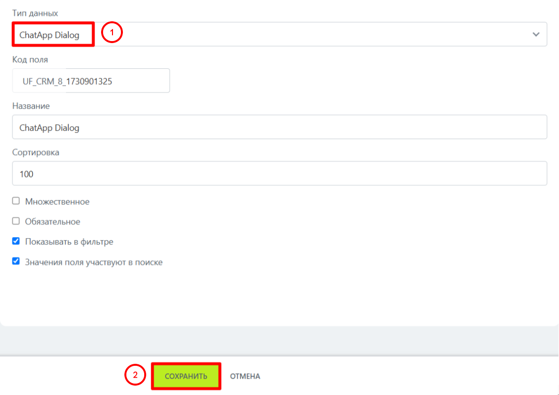 Важно: если вы установили приложение ChatApp в Битрикс24 до 06.11.2024, чтобы добавить кнопку «ChatApp Dialog» в поле карточки, вам понадобится удалить приложение и установить его заново.