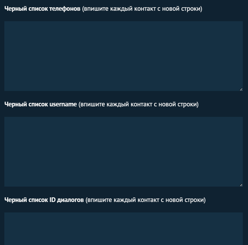 - Введите номер телефона, username или ID диалога, чтобы внести его в черный список.