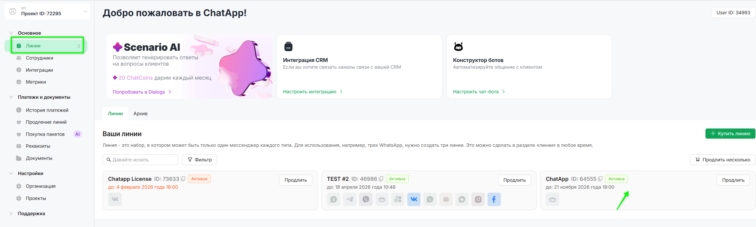 Недостающие каналы можно докупить для существующей линии в Личном кабинете ChatApp.