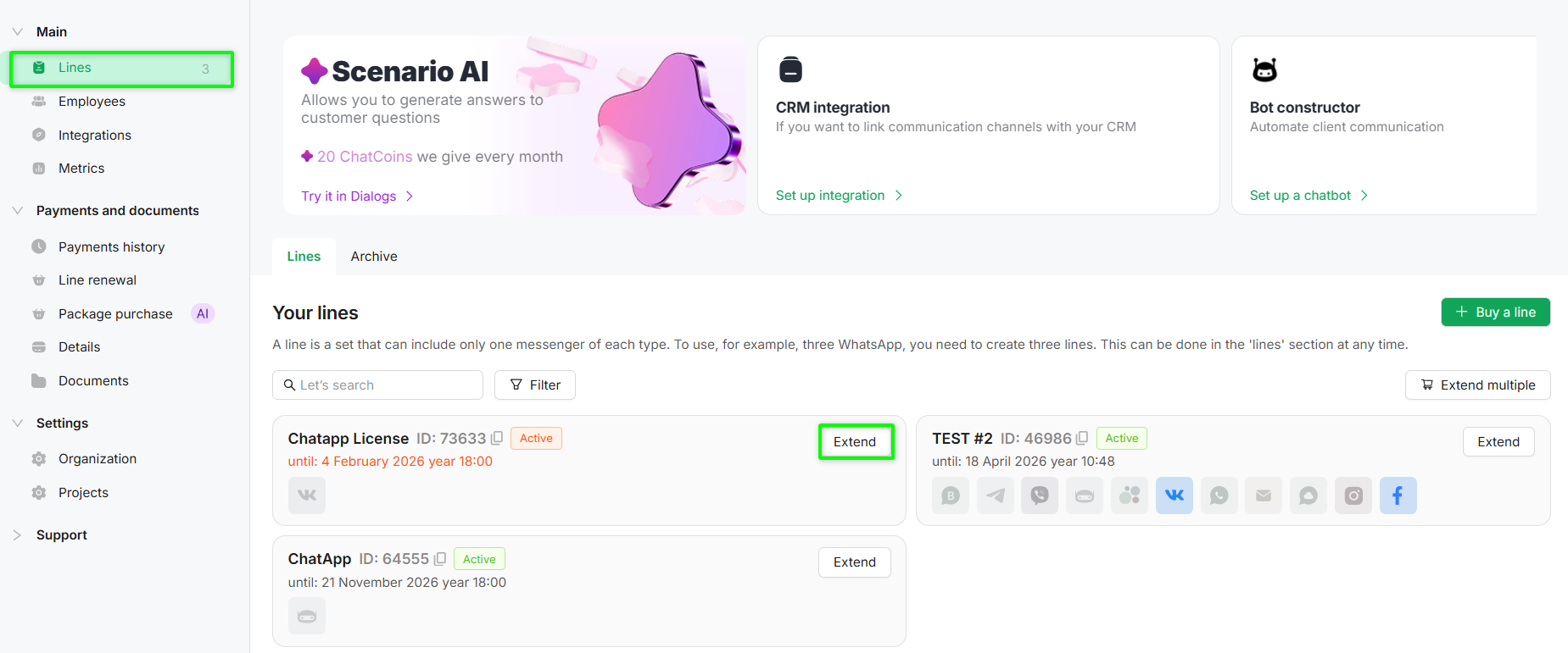 Adding messengers and changing the line configuration is available no later than 5 days before the line expiration date in the «Lines» section.