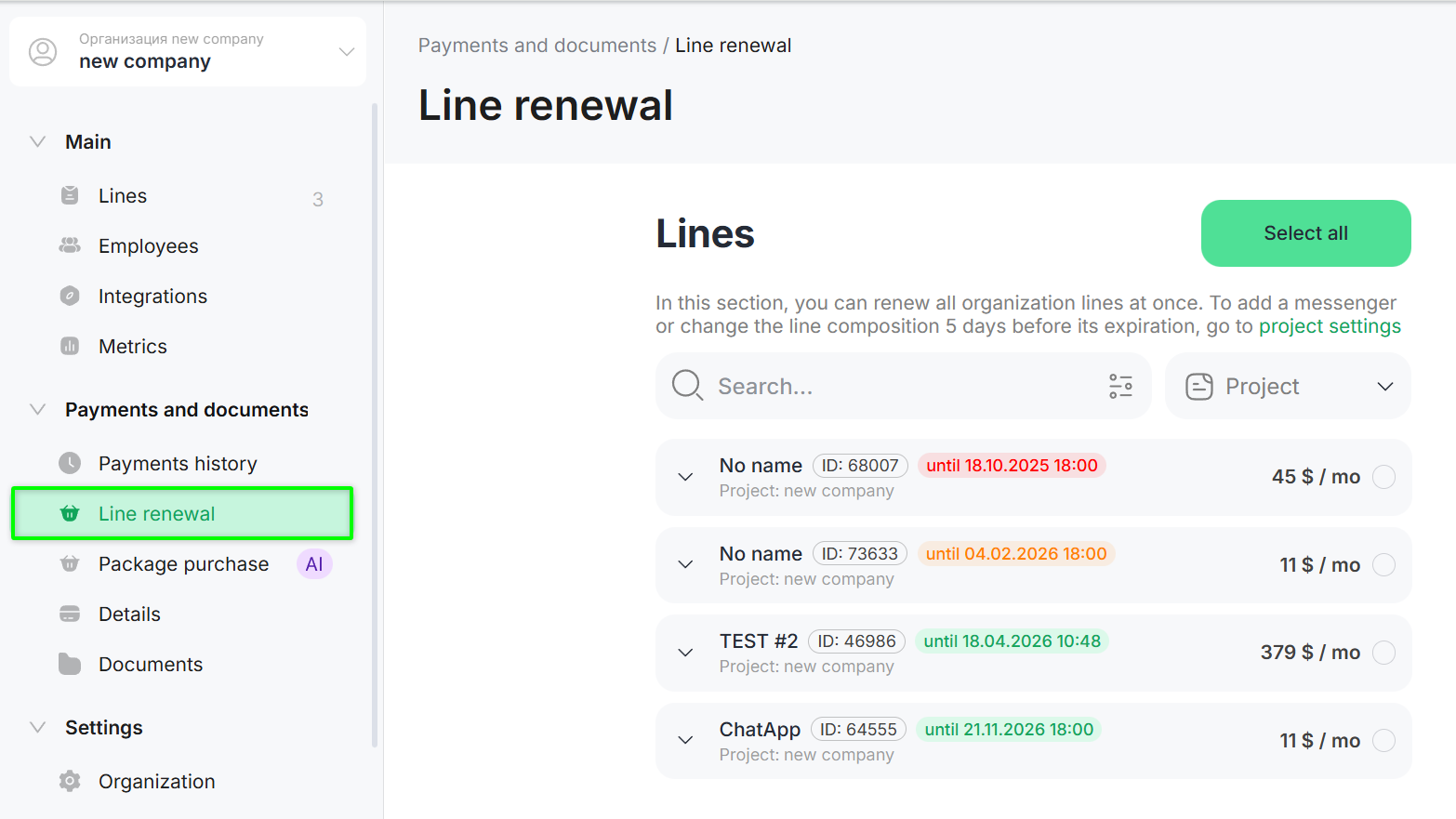 In the «Line Renewal» section, you can renew all organization lines with a single payment.