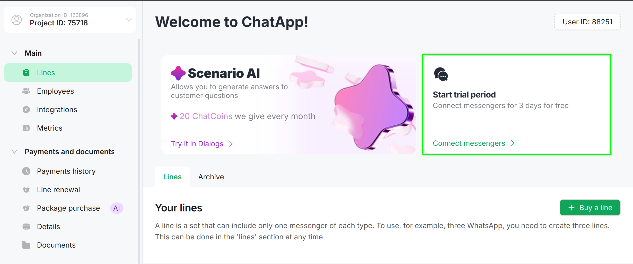 After the demo period ends, the demo line can be extended — all connected channels and configured automations will be preserved.