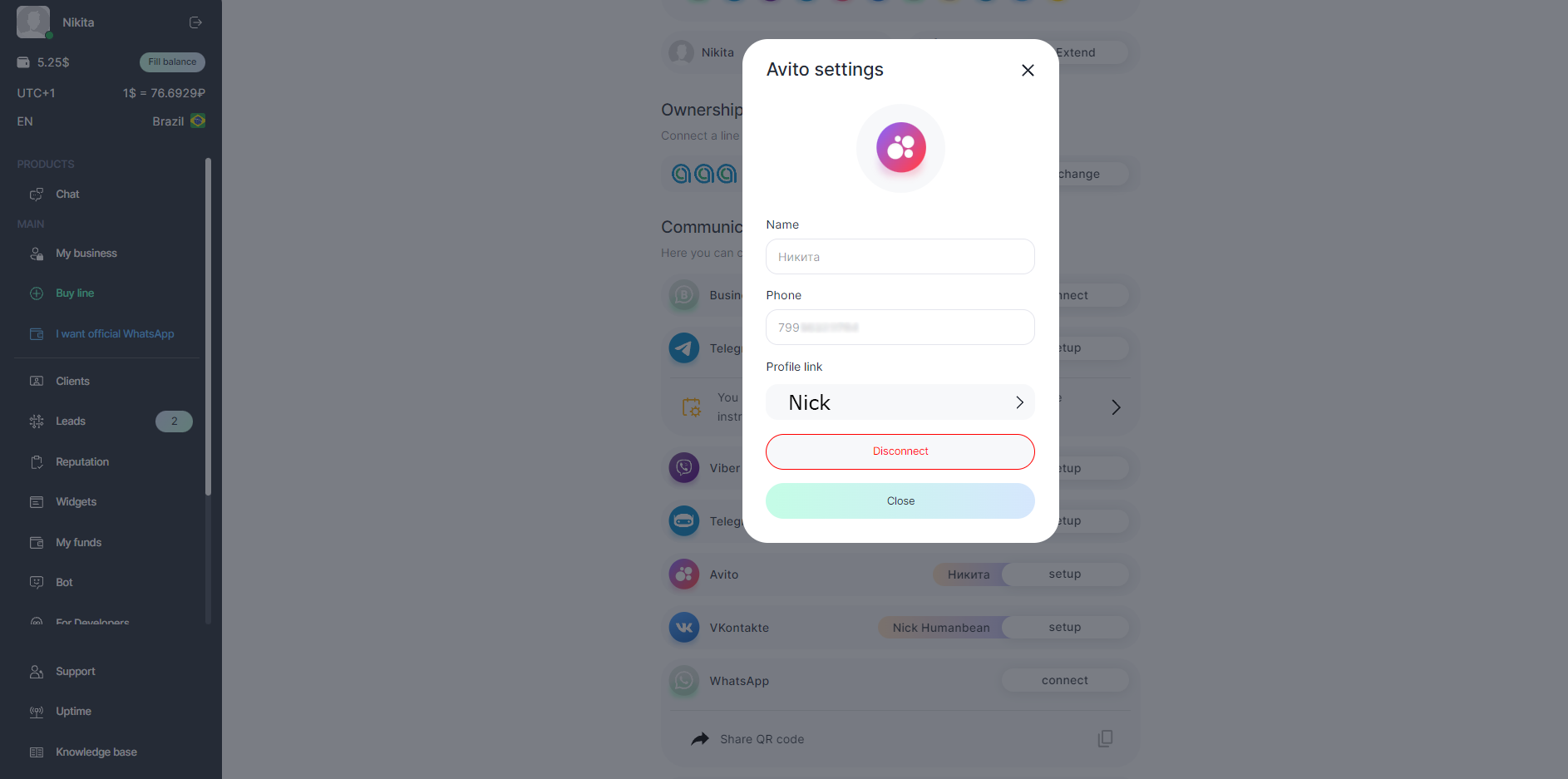 - In the settings, you can see the phone number to which Avito is connected, the name of the account owner, and get a link to the profile. You can also disable your Avito account.