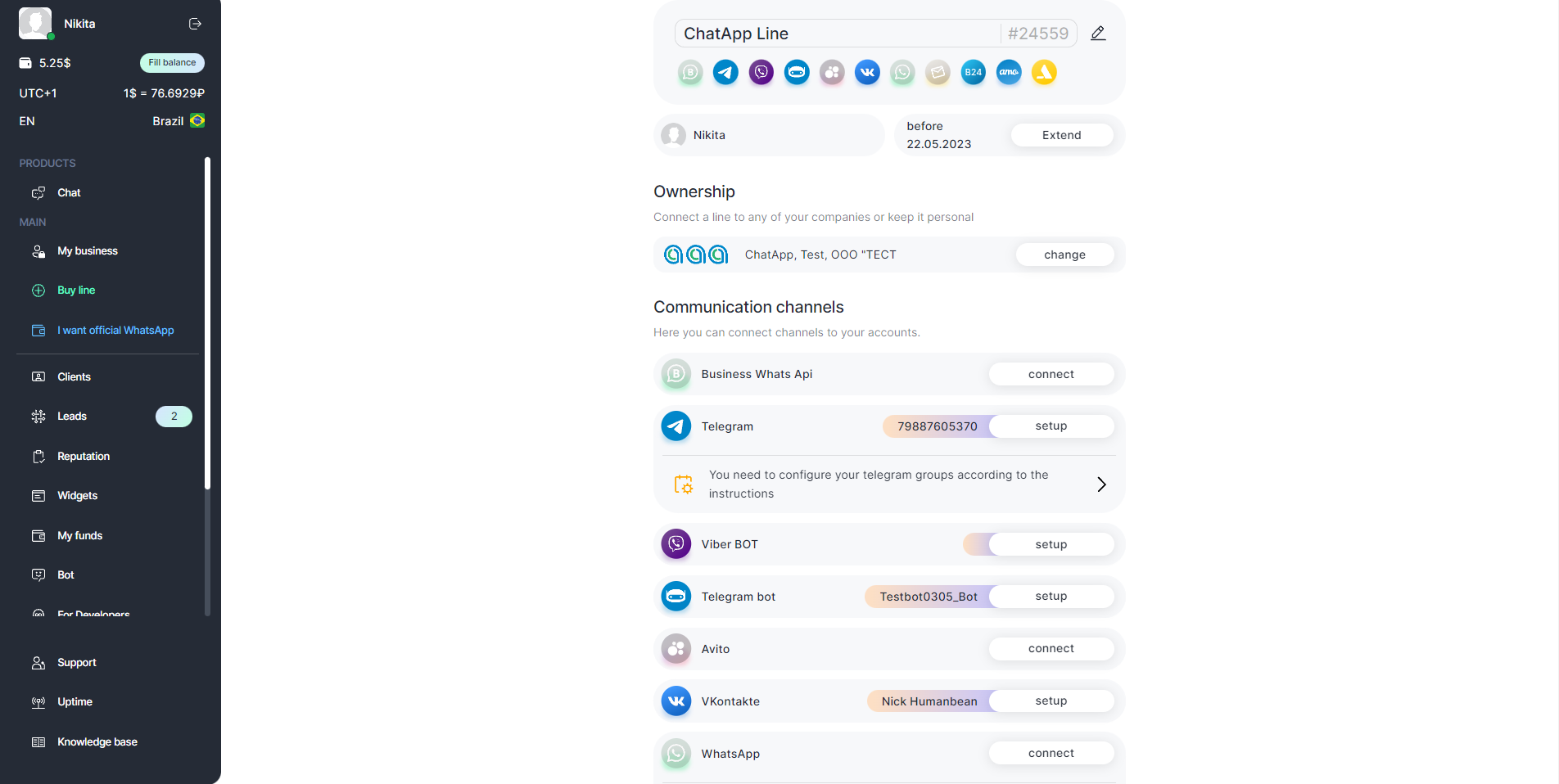 - In the “Selected company” section, open the line and click “setup” next to the connected Avito channel.