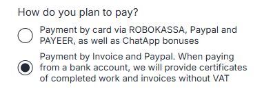4. Choose a payment method: Payment by card via ROBOKASSA, Paypal and PAYEER, as well as ChatApp bonuses or Payment by Invoice and Paypal.
