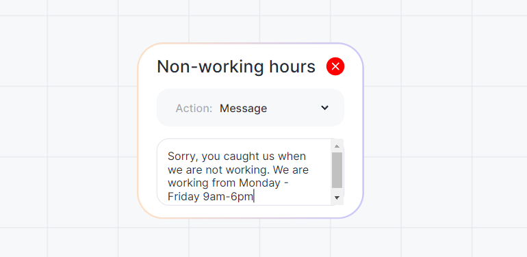The block will prevent you from running the main script if the client has written to you outside of your working hours. It will send a prepared message to the client. You can set up the work schedule in your personal account. How to do this is described in the “Work schedule” article.