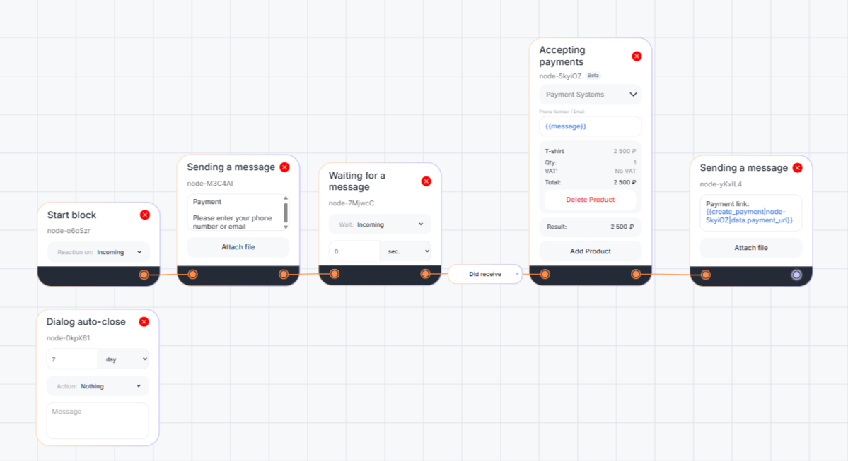For example, you can create a scenario in which the bot requests a phone number or email from the client, the “Accepting payments” block initializes the payment, and the “Sending a message” block sends the client a payment link.