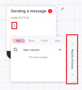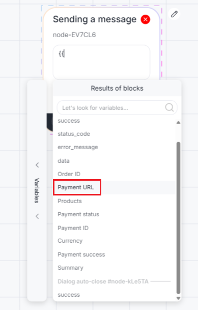 7. To send the payment link to the client, add the “Sending a message” block, enter the double curly brackets “{{“, open the “Results of blocks” section and select the result “Payment URL”.