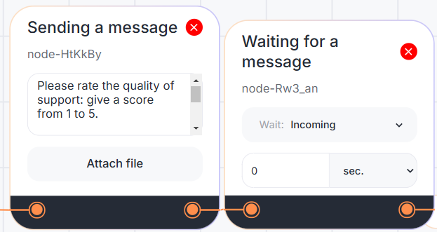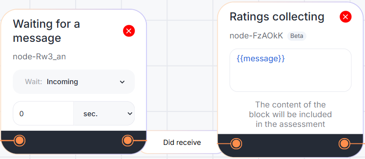 The “Rating Collection” block gathers user ratings during conversations and saves them in the “Metrics” section. This block can be useful, for example, to evaluate the performance of technical support specialists. It is typically used in combination with the “Send Message” and “Wait for Message” blocks.