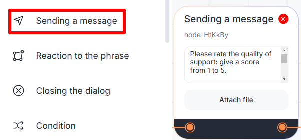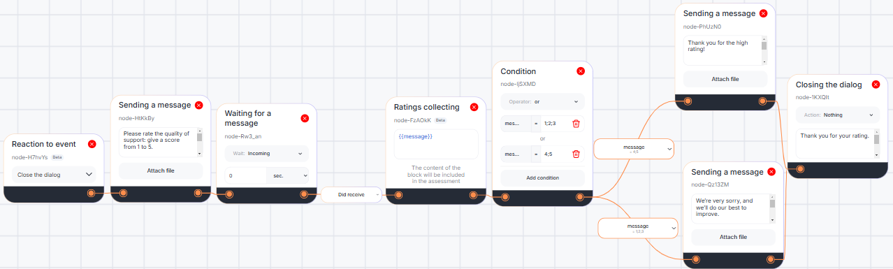 The block can be used, for instance, in a technical support scenario. After the dialog is closed, the bot will send a message to the client requesting a rating and save the result in the “Rating” field within the “Metrics” section. Depending on the given rating, an appropriate follow-up message will be sent.