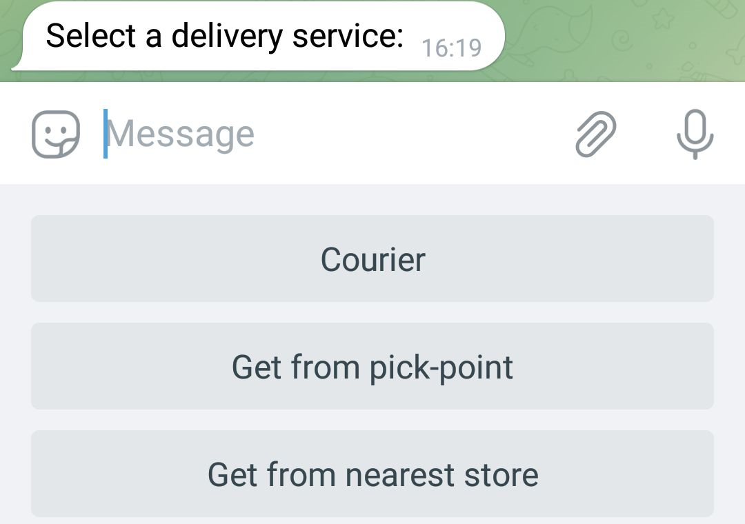 - Buttons cannot be sent together with a file. Because the type of such message is “file”, the system does not recognise the difference between buttons and messages. Therefore, the client will receive plain text in curly braces