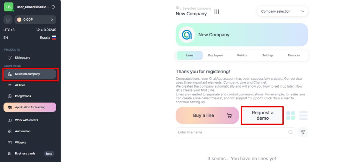 You can activate DEMO line, after you authorize in your account, this way: