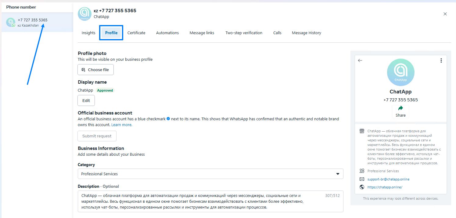 To change the profile name, click on “Edit”. Enter the new company name in the text field and click Next. Facebook will check 24 hours to see if the new name fits the company. The display name must be associated with your company, not violate WhatsApp’s Trade Policy, WhatsApp Business Messaging Policy, and comply with Facebook’s Rules regarding Display Names. After completing the Facebook verification, contact ChatApp technical support to change your name. Important: the company can change the display name no more than 10 times within 30 days.