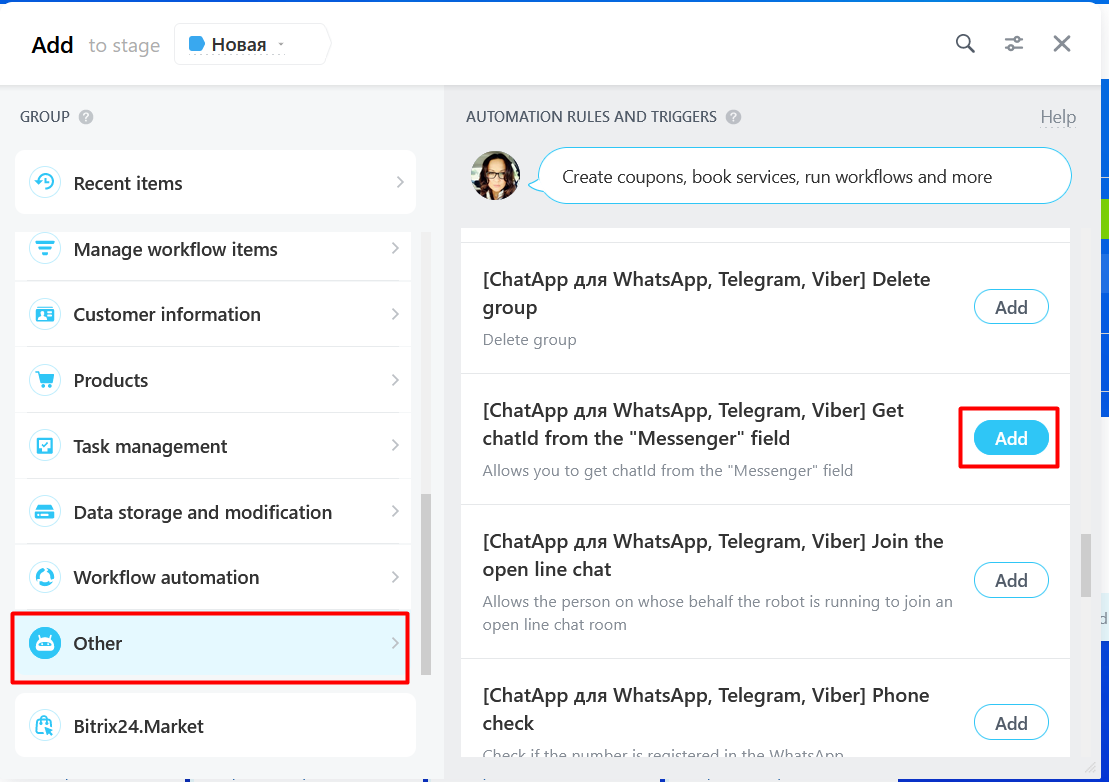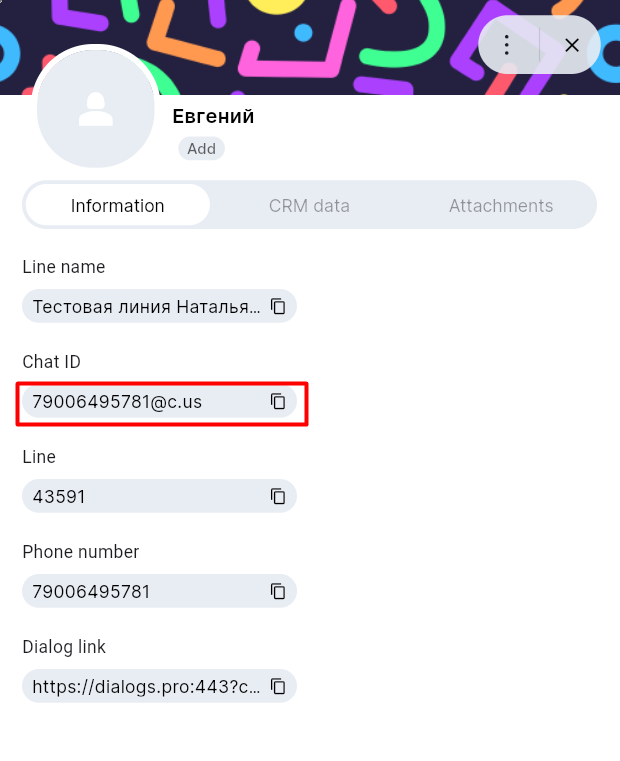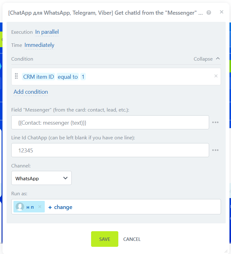 The chatId variable is a general way to get ChatApp client data. Some messengers don’t have phone numbers (TelegramBot, ViberBot, Instagram, Facebook*, VK, Avito). Then you can start a dialogue via Bitrix24 webhook by getting the ChatId of the ChatApp client.