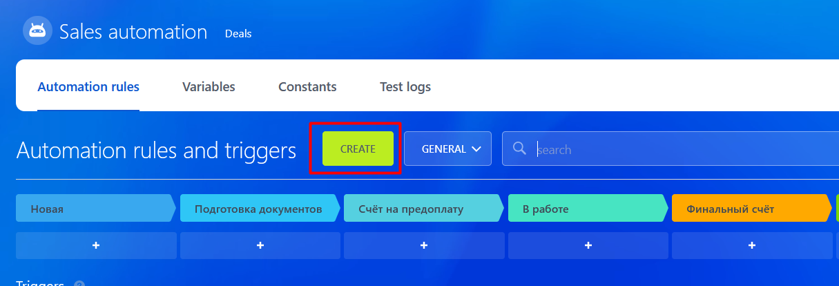 2. In the Automation rules and triggers section choose “Create” new robot.