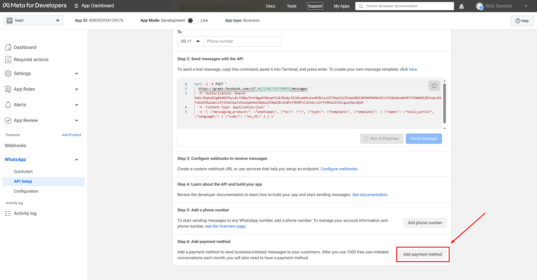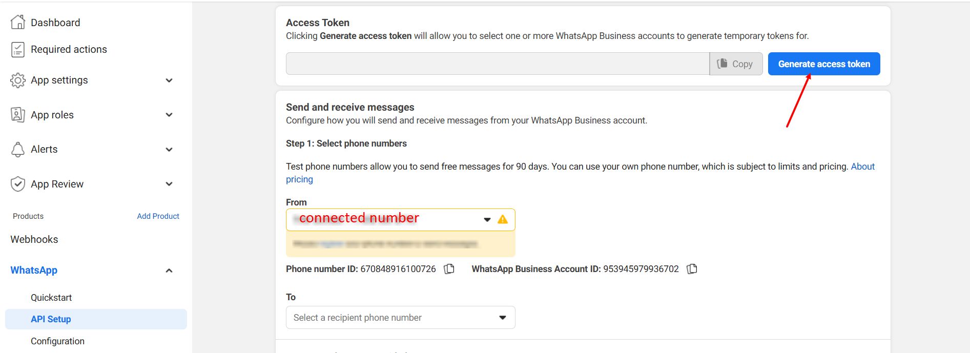4. After successful token generation, send a test message by entering your personal WhatsApp phone number.