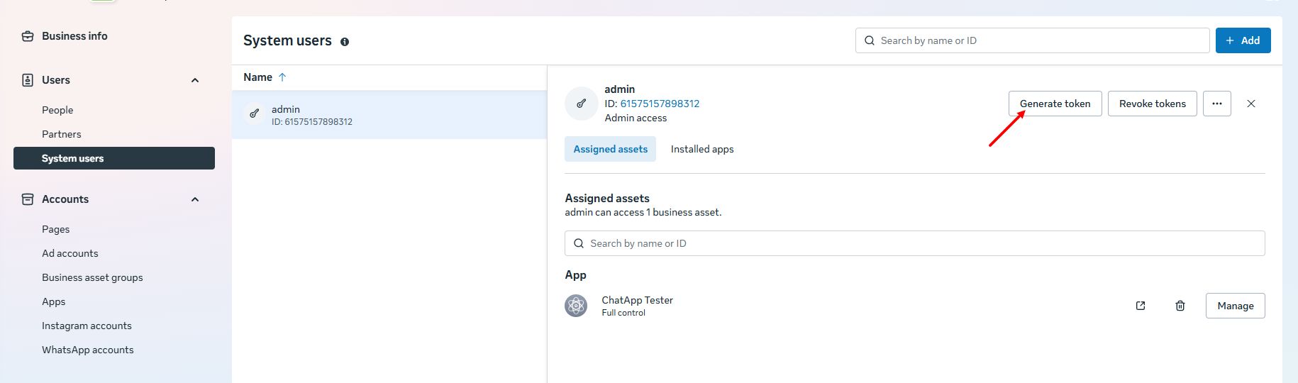 If the System user token generated during the initial connection of the number is lost, you must contact ChatApp technical support by providing the line identifier (ID) to which the first WhatsApp Cloud API number is linked.