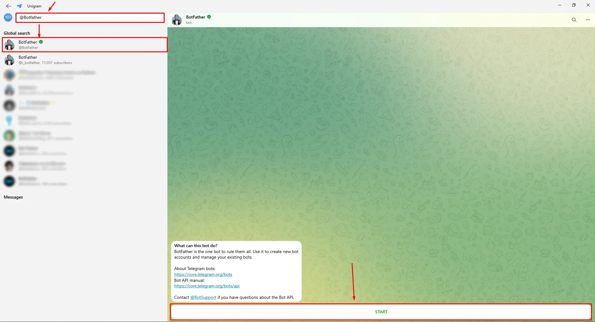 2. In the search bar enter the name @BotFather – this is a universal tool for creating bots. After that, press the /Start button and follow the further instructions;