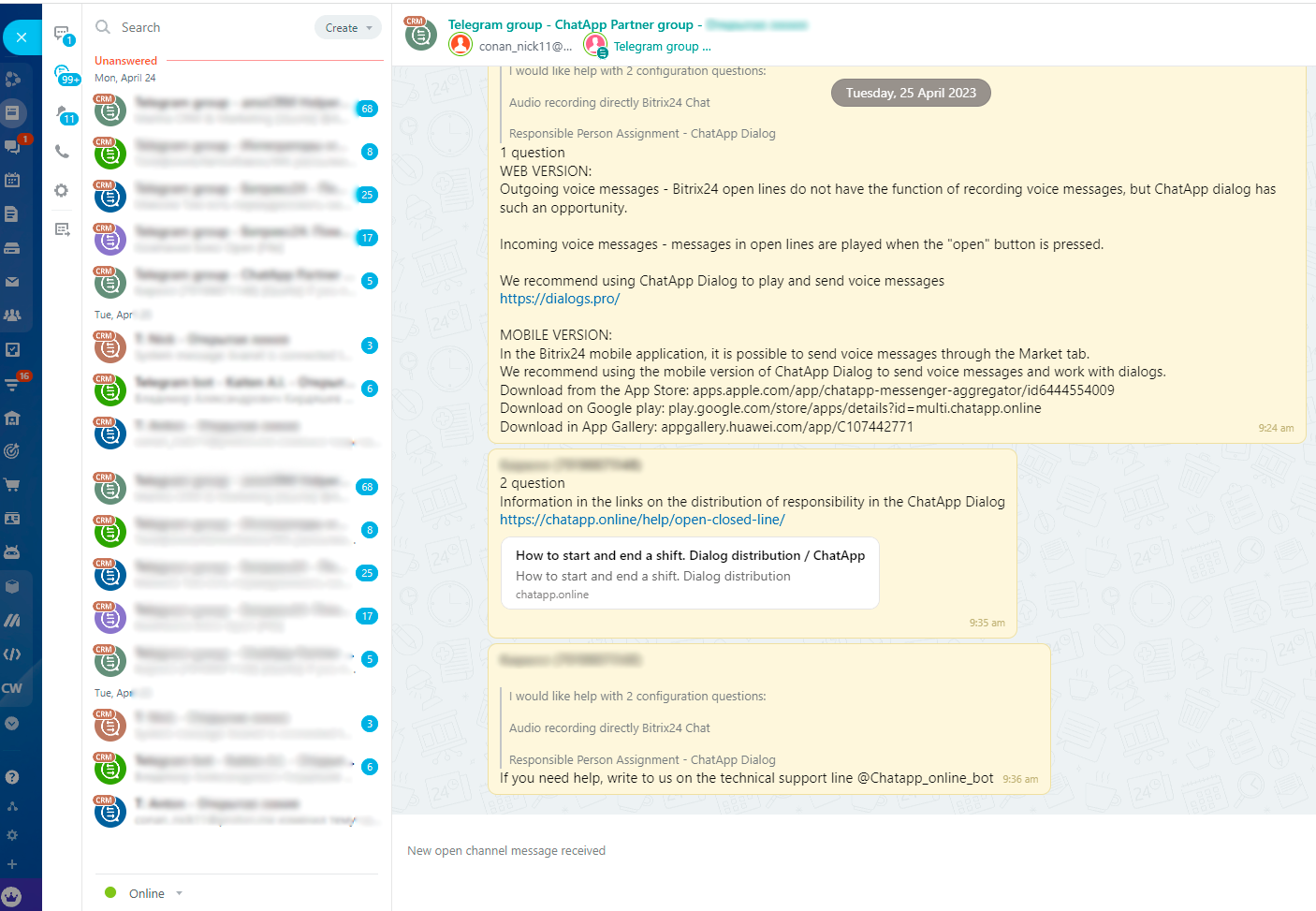 Imagine that you have made a mailing list for 250 people. Of course, you didn’t get a lot of dialogs because you turned off automatic messages in the connector settings. Clients begin to respond to the mailing list and in order to get an answer as soon as possible, you set up a queue of employees responsible for the dialogues: