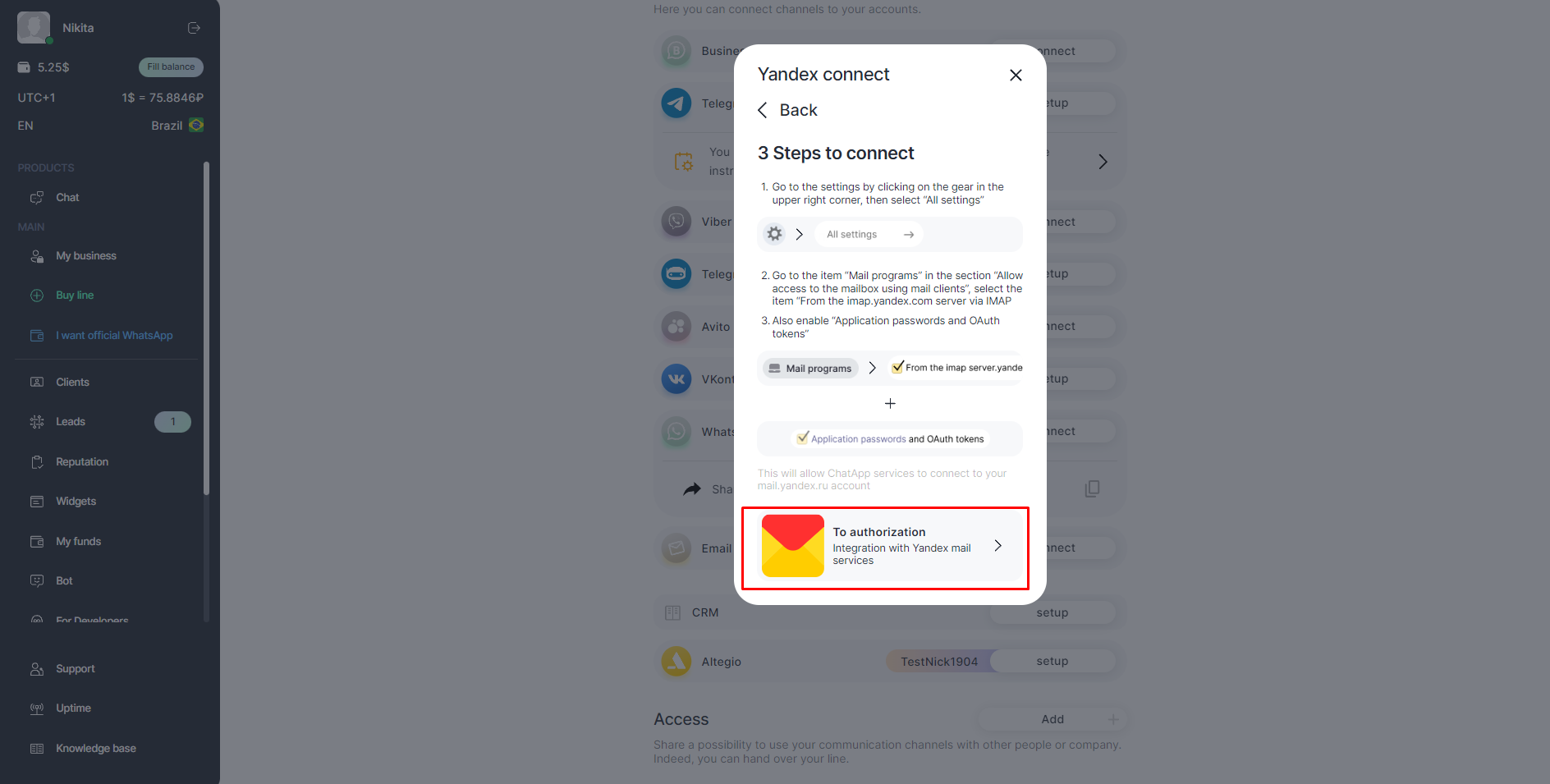 2. Click on Yandex and To authorize;