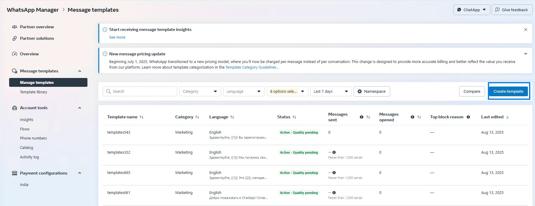 In the WhatsApp Cloud API, it is possible to use empty templates without pre—prepared text. This template will be universal — you can enter any message into it using a variable.