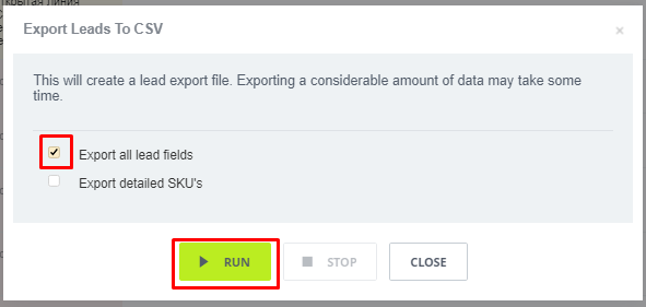 • In the pop-up window, check the box next to “Export all lead fields” and click on the “Run” button.