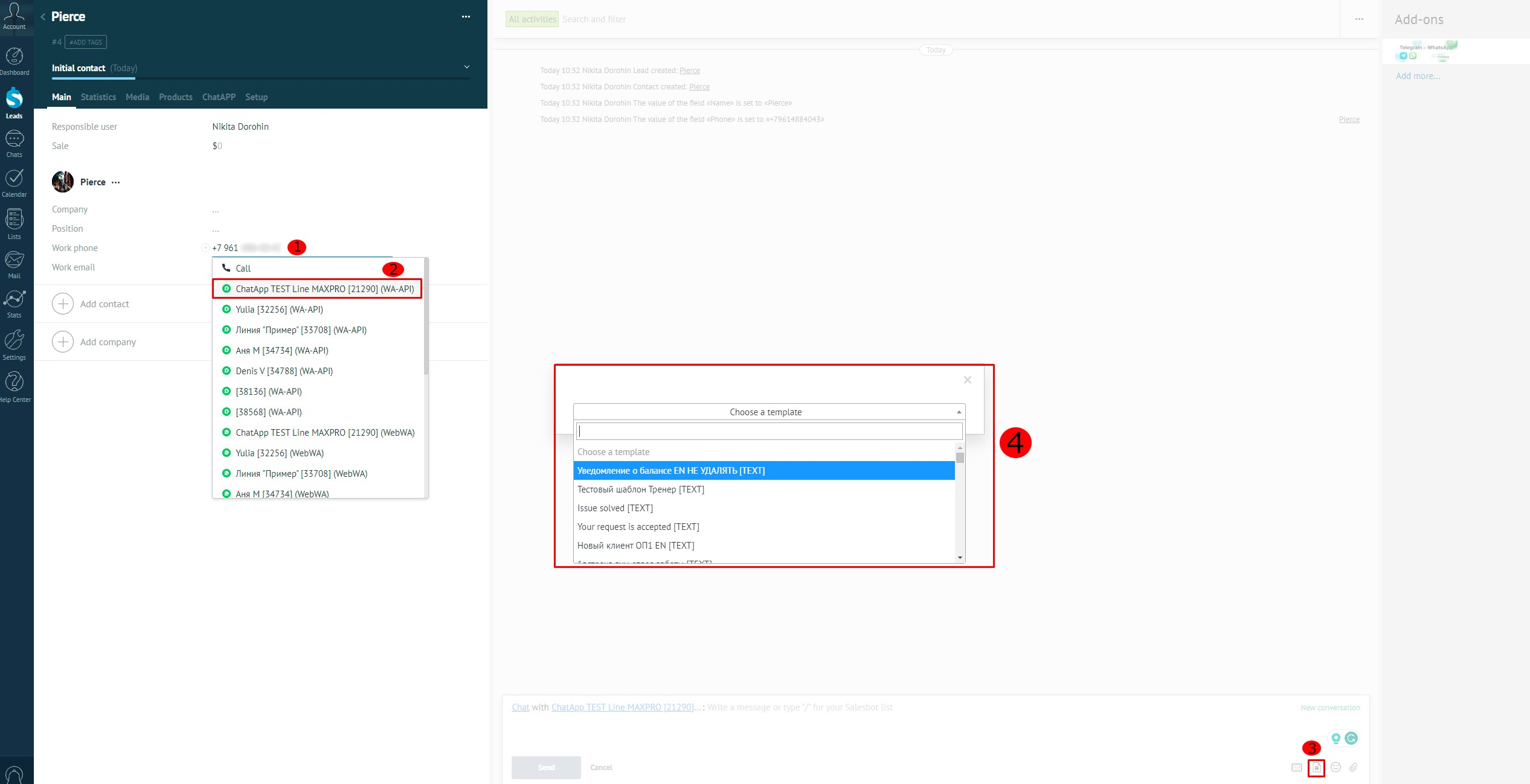 To write via WhatsApp Business API, you need to go to the Deal, select a channel (license) and a contact for communication. Next, you need to open a window with a list of templates and select a template message to send.